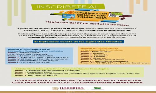 “El objetivo del diplomado en Educación Financiera es la adquisición de conocimientos y competencias para el mejor aprovechamiento de los servicios y productos financieras que fortalezcan sus capacidades en el manejo del dinero, coadyuvando con ello a su bienestar y el de su familia. El diplomado en educación financiera es gratis, 100 por ciento en línea y abierto a todo el público a partir del nivel bachillerato”, especificó.