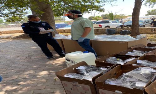 Hermosillo, Sonora, a 13 de mayo de 2020.- La Jefatura de Policía Preventiva y Tránsito de Hermosillo recibió de parte del personal de la Iniciativa Va Por Hermosillo equipo de protección para realizar las labores de vigilancia e insumos para la desinfección de áreas de trabajo.