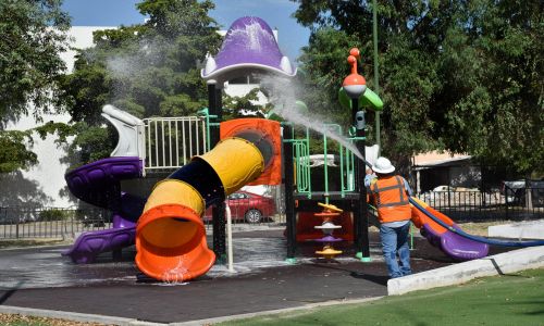 Hermosillo, Sonora; junio 02 de 2020.- Sin bajar la guardia en el propósito de reducir la carga viral en espacios públicos con tránsito de ciudadanos, el Ayuntamiento de Hermosillo realizó la limpieza profunda de las distintas áreas del parque de la colonia Pitic.