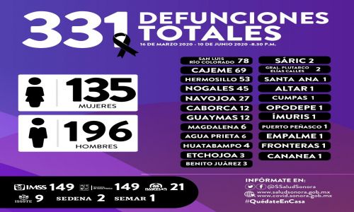 Con estos, se acumulan 331 defunciones en Sonora y con los 217 casos confirmados este día,  se llegó a 4 mil 011 casos de Covid-19 en la entidad.