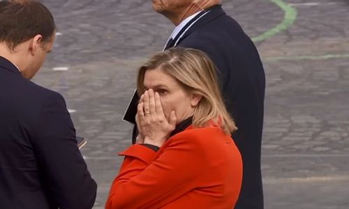 PARÍS.– Una ministra del gobierno de Francia escondió su rostro en sus manos después de que se dio cuenta de que había llegado al desfile anual del día nacional y olvidó su máscara.