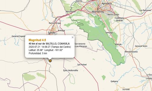 En Twitter, el SSN dijo que se registró a las 14:09 horas (tiempo central de México) a una profuncidad de 5 kilómetros y a 40 kilómetros de Saltillo.