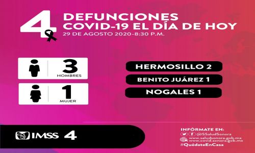 Michelle Ariana López Arrizon, doctora de la dirección general de Salud Mental y Adicciones de la Secretaría de Salud Sonora, informó que entre el 2 de julio y el 29 de agosto fallecieron 4 personas, 3 hombres y 1 mujer, de entre 27 y 71 años de edad, quienes iniciaron síntomas entre el 30 de junio y el 11 de agosto, acumulándose 2 mil 667 defunciones en Sonora.