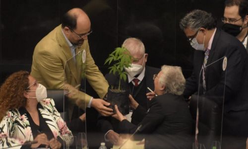 El senador sin partido le explicó que la planta de marihuana formaba parte del cultivo de activistas que mantienen desde el mes de febrero en el parque Luis Pasteur: “mire que grande está, desde su capacidad de competencia e inteligencia ayúdenos a que esto sea un derecho”, le pidió Emilio Álvarez Icaza a Sánchez Cordero.