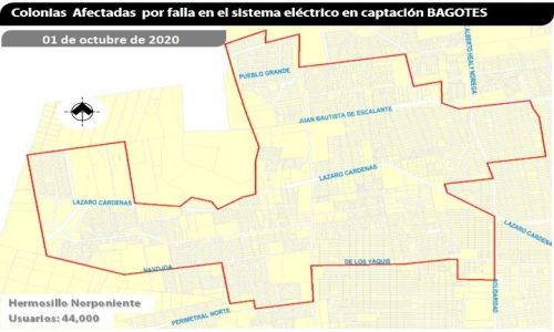 Hermosillo, Son. 01 de octubre de 2020.- Una falla en el suministro de energía eléctrica dejó fuera de operación los pozos del sistema de captación Los Bagotes, lo que provocó la suspensión del servicio de agua potable en alrededor de 80 colonias de la zona norponiente de la ciudad.