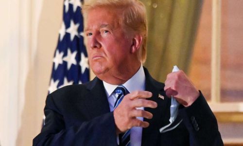Trump llegó a la Casa Blanca el lunes usando una mascarilla blanca que de inmediato se retiró para posar ante las cámaras y saludando desde el Pórtico Sur de la mansión presidencial.