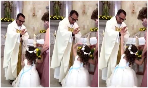Un nuevo video viral ha sacudido las redes sociales pues muestra el tierno e inocente momento en el cual una niña está a punto de recibir la bendición de un sacerdote y reacciona de la manera menos esperada, provocando la risa de todos en la iglesia.