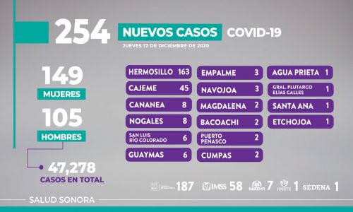 Este día, se registraron 254 nuevos casos por COVID-19, en 149 mujeres y 105 hombres, para un total de 47 mil 278 casos en la entidad. De los 254 casos nuevos, 163 son residentes de Hermosillo; 45 de Cajeme; ocho de Cananea; ocho de Nogales; seis de San Luis Río Colorado; seis de Guaymas; tres de Empalme; tres de Navojoa; dos de Magdalena de Kino; dos de Bacoachi; dos de Puerto Peñasco; dos de Cumpas; uno de Agua Prieta; uno de General Plutarco Elías Calles; uno de Santa Ana y uno de Etchojoa.