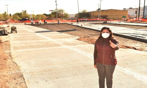 Hermosillo, Sonora; diciembre 31 de 2020.- Acompañada por colaboradores y personal operativo de la Coordinación de Infraestructura, Desarrollo Urbano y Ecología (CIDUE), la alcaldesa de Hermosillo Celida López Cárdenas, constató los avances en la rehabilitación con concreto hidráulico del crucero del bulevar Quiroga con la calle Perimetral, al Norponiente de la ciudad.