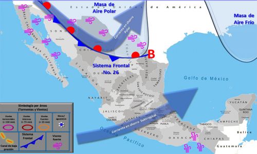 Lo anterior, generará condiciones de cielo medio nublado a nublado, con muy baja probabilidad de lluvias, principalmente en las regiones norte, noreste y oriente, con vientos moderados a fuertes y marcado descenso de temperaturas, principalmente en las regiones norte, noreste y oriente del estado.