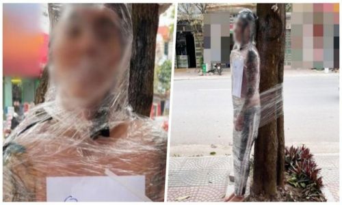 Las fotos de un hombre atado a un árbol corrieron rápidamente a través de las redes sociales de Hanoi, capital de Vietnam, donde el susodicho se negó a pagar por un tatuaje y el dueño del estudio lo envolvió en su papel de víctima, le colgó un letrero y lo exhibió a la mitad de la calle.