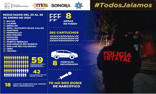 Estas acciones fueron resultado de la atención a denuncias ciudadanas al 089 y 9-1-1 y operativos en el municipio de Hermosillo, Cajeme, Bácum, Yécora, Empalme, San Luis Río Colorado, Nogales, General Plutarco Elías Calles, San Ignacio Río Muerto, Ures, Guaymas, Opodepe, Puerto Peñasco y San Javier.