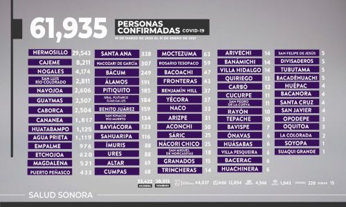 Hoy se suman 471 nuevos casos por COVID en 240 hombres y 231 mujeres; acumulándose 61 mil 935 casos en total. De los casos nuevos 272 eran residentes de Hermosillo; Cajeme 38; Nogales 29; Caborca 21; Guaymas y Huatabampo 18 cada uno; Empalme 17; Navojoa 14; Cananea 11; San Luis Río Colorado 6; Bácum y Álamos 5 cada uno; Pitiquito 4; Magdalena y Moctezuma 2 cada 1; Tepache, Santa Ana, Ures, Benito Juárez, Altar, Oquitoa, Cumpas, Nácori Chico y Etchojoa 1 cada uno.