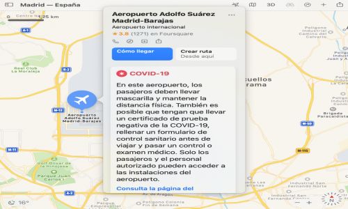 Para facilitar a los viajeros el momento aeropuerto, la app Mapas ha comenzado a mostrar las medidas covid de los aeropuertos adscritos al Consejo Internacional de Aeropuertos (más de 300 por todo el mundo).