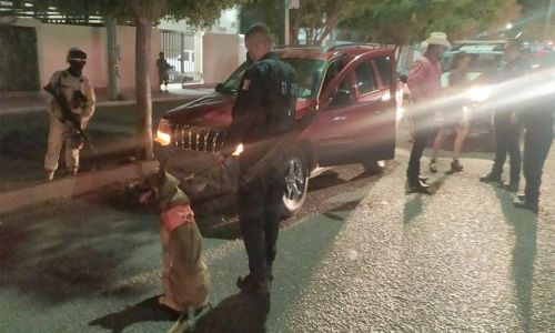 Cajeme, Sonora; mayo 6 de 2021. Con apoyo de las unidades caninas de la Policía Estatal de Seguridad Pública (PESP) y de fuerzas armadas federales se refuerzan los operativos y patrullajes de vigilancia en Cajeme.