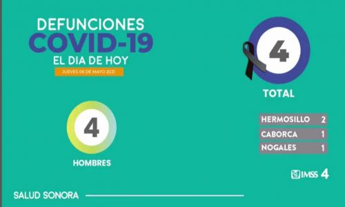 Los 4 fallecimientos de este día fueron en 4 hombres, residentes de: Hermosillo 2; Caborca y Nogales 1 cada uno; con lo que se acumulan 6 mil 270 defunciones.