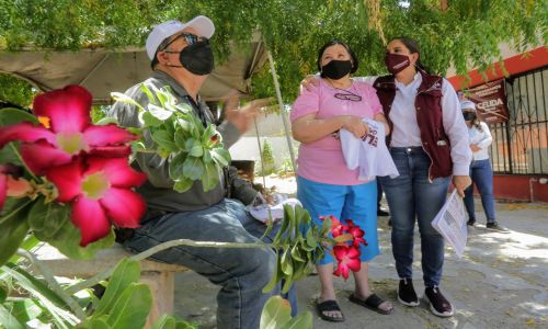 Acompañada por su compañero de fórmula para síndico municipal, David Mendoza, así como del candidato a diputado local por el Distrito 9, Armando Moreno Soto, la morenista visitó y platicó este martes con vecinas y vecinos de la colonia Sahuaro Indeco, ubicada al poniente de la ciudad.