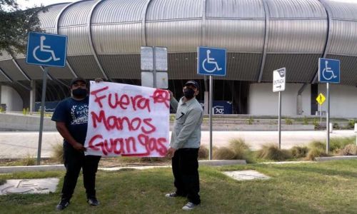 En redes sociales circularon fotos de las mantas, incluida una sostenida por un par de personas dentro del Restaurante Azul y en la que se lee: “Fuera Manos Guangas”, en alusión a un apodo que se le dio al jugador.