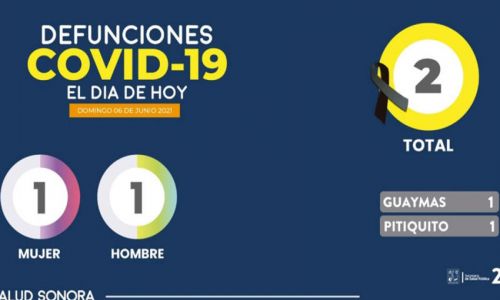 Este domingo, se confirmaron dos fallecimientos, en una mujer y un hombre; una de las personas era residentes de Guaymas; y la otra de Pitiquito; ambas personas eran derechohabientes de la Secretaría de Salud, acumulándose un total de 6 mil 399 defunciones.