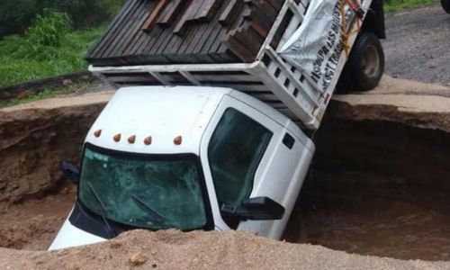 En Oaxaca, lluvias provocan socavon; se traga camioneta