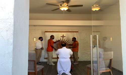 Cd. Obregón, Sonora; julio 23 de 2021. Como una forma de apoyar el fortalecimiento espiritual al interior del Centro de Reinserción Social (Cereso) de Cajeme, Personas Privadas de su Libertad (PPL) participaron en la construcción de una capilla al interior del mismo, donde se oficiará periódicamente misa y podrán acudir quienes así lo deseen, informó el director Jorge Arturo Argüelles.