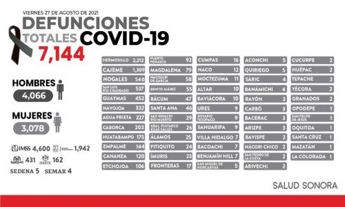 Hermosillo, Sonora; agosto 27 de 2021. La Secretaría de Salud en Sonora dio a conocer que este jueves se confirmaron 20 decesos y 555 nuevos casos de COVID-19, con lo que se acumulan 7 mil 144 defunciones y se acumulan 98 mil 299 casos que han sido positivos en la entidad desde el inicio de la pandemia.