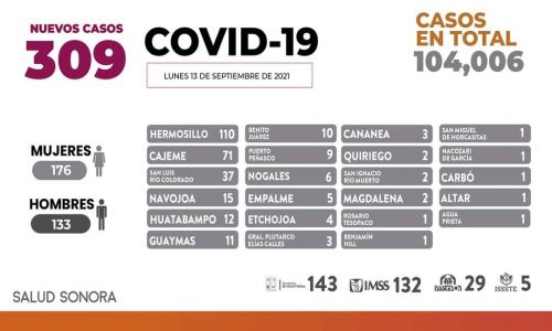 Los 309 contagios, de acuerdo a los datos de la autoridad de salud corresponden a 176 mujeres y 133 hombres, residentes de Hermosillo 110, Cajeme 71, San Luis Río Colorado 37, Navojoa 15, Huatabampo 12, Guaymas 11 y Benito Juárez 10.