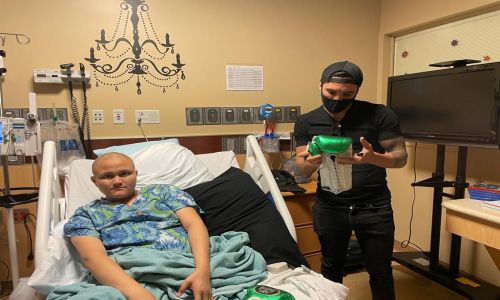 “Aquí visitando a un campeón de vida Carlos Molina, lo invité a mi última pelea y hoy tuve oportunidad de visitarlo en el hospital. Es un joven de 15 años muy valiente, que está enfrentando una dura pelea contra el cáncer. Conocerlo me enseña mucho más que los golpes en el ring, ningún problema ni dolor es más grande que la lucha que enfrentan los niños con cáncer y sus familiares”.