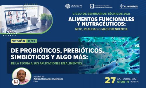 Como parte del “Ciclo de seminarios técnicos 2021. Alimentos funcionales y nutracéuticos. Mito, realidad o macrotendencia”, y en el marco del 39º aniversario del Centro de Investigación en Alimentación y Desarrollo (CIAD), se impartirá la conferencia “De probióticos, prebióticos, simbióticos y algo más: de la teoría a sus aplicaciones en alimentos”, que será dictada por el profesor Adrián Hernández Mendoza.