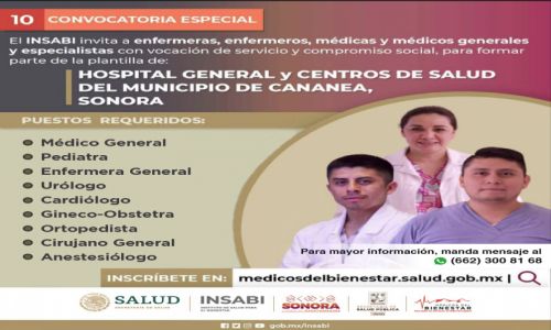 Hermosillo, Sonora; 22 de octubre de 2021.- La Secretaría de Salud de Sonora, a través del Instituto de Salud para el Bienestar (Insabi) busca personal médico y de enfermería para el Hospital General de Cananea y centros de salud de dicho municipio.