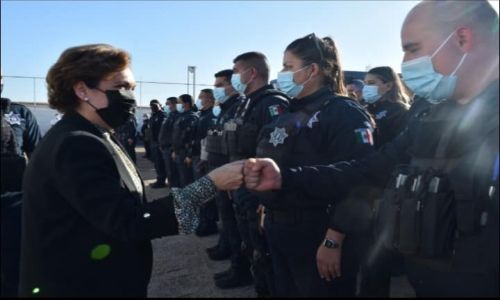 En Cajeme, la secretaria también realizó un recorrido por la base operativa de la Policía Estatal, donde instruyó a los elementos a fortalecer las acciones de seguridad para coadyuvar con las autoridades de los tres niveles de gobierno en el combate y prevención del delito, además de atender oportunamente la denuncia ciudadana.