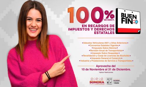 Hermosillo; Sonora; 10 de noviembre de 2021.- El Gobierno de Sonora, a través de la Secretaría de Hacienda, participará en el programa El Buen Fin 2021 con descuentos del 100 por ciento en recargos de impuestos y derechos estatales, en beneficio de las y los contribuyentes sonorenses para que tengan la oportunidad de regularizarse en estos rublos, informó Omar Del Valle Colosio.
