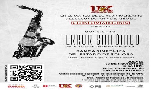 Las instalaciones de Universidad Kino se vestirán de gala este jueves 18 de noviembre con la presentación del Concierto Terror Sinfónico con soundtracks de los clásicos de terror, desarrollado por la Banda Sinfónica del Estado de Sonora.