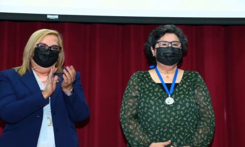 En el marco de la emotiva ceremonia celebrada de manera presencial en el auditorio del Centro de las Artes, la rectora Plancarte Martínez hizo entrega de una placa de reconocimiento y medalla de plata a la doctora Mérida Sotelo Lerma por sus resultados de investigación en el campo de los Materiales, participar durante más de tres décadas en la formación de recursos humanos y su firme decisión de continuar siendo una universitaria ejemplar.