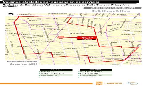 Con el objetivo de aprovechar los trabajos de mejoramiento vial que realiza CIDUE en el cruce de las calles General Piña y Rebeico, personal del área operativa de Agua de Hermosillo realizará reemplazo de infraestructura hidráulica y con ello se deberá suspender el servicio momentáneamente para ocho colonias del norte de la ciudad.
