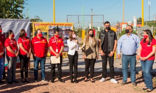 CIUDAD OBREGÓN.- La Presidenta del Voluntariado de DIF Cajeme, Patricia Patiño, realizó el corte simbólico de la rehabilitación del parque incluyente del Boulevard Ramírez en esta ciudad, fue el Gerente de Plaza de Oxxo, Jorge Humberto Mata Haro, quien dio la explicación a la Mtra. Patiño, sobre los trabajos realizados por esta empresa en el lugar, como aportación de capital social a la comunidad.