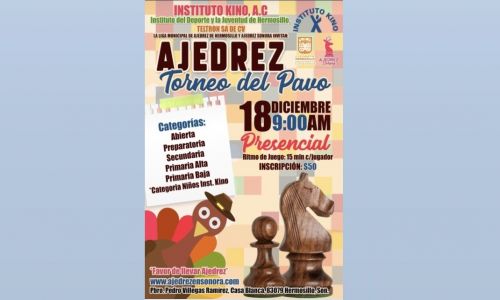 Ajedrez Sonora y el Instituto Kino, con el apoyo y respaldo logístico de Teltron S.A. de C.V., el Instituto del Deporte y la Juventud de Hermosillo, así como de la Liga Municipal de Ajedrez de Hermosillo, realizarán el tradicional Torneo del Pavo en su edición 2021.