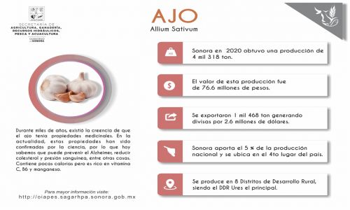 Hermosillo, Sonora; 5 de enero de 2022.- Las bondades medicinales del ajo también generan progreso para las comunidades que lo producen, ya que en el año 2020 Sonora obtuvo una producción de cuatro mil 318 toneladas de esta hortaliza, informó la subsecretaria de Agricultura de la Sagarhpa.
