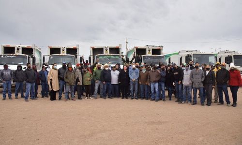 El presidente municipal, los integrantes del comité sindical, delegados y trabajadores se tomaron la foto del recuerdo frente a la flota de camiones del servicio de recolección de basura.