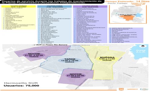 Hermosillo, Son. 10 de febrero de 2022.- Del lunes 14 al lunes 28 de febrero, todas las colonias del sur de Hermosillo contarán con horarios de servicio sectorizados, debido a que se recibirá la mitad del agua que llega vía el Acueducto Independencia hacia la planta potabilizadora.