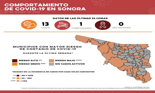 Hermosillo, Sonora, 8 de marzo de 2022.- Este día la Secretaría de Salud de Sonora (SSA) confirmó 13 nuevos casos y ninguna defunción por Covid-19.