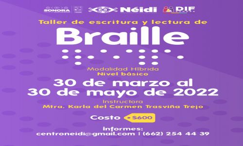 La duración del taller de lectoescritura en sistema braille tendrá una duración de 36 horas, se entregará un reconocimiento que haga constar su aprendizaje y tendrá un costo de 600 pesos. Para mayor información, las personas interesadas se pueden comunicar a los teléfonos: (662) 254 44 39 o al correo electrónico: centroneidi@gmail.com