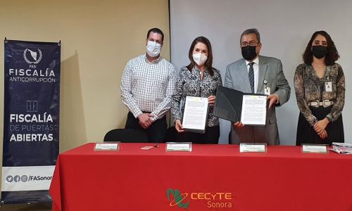 | Hermosillo, Sonora; 24 de marzo de 2022.- Para fortalecer el combate a la corrupción, así como la cultura de la legalidad y de la denuncia en los planteles del Colegio de Estudios Científicos y Tecnológicos del Estado de Sonora (Cecyte), la directora general, Gracia Alicia Anduro Grijalva, firmó convenio de colaboración con la Fiscalía Anticorrupción de Sonora (FAS).