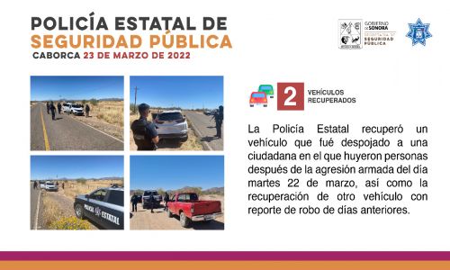Hermosillo, Sonora; 26 de marzo de 2022. La Policía Estatal de Seguridad Pública (PESP) en Sonora tiene presencia permanente en la zona de Caborca y Pitiquito, donde obtuvo resultados con el aseguramiento de personas, armas, vehículos y sustancias prohibidas a través de los operativos coordinados con los tres órdenes de gobierno, informó la secretaria de Seguridad Pública, María Dolores del Río Sánchez.