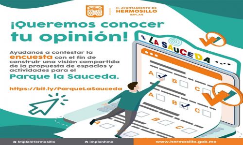 Quienes se interesen en expresar su opinión mediante la encuesta sobre el parque La Sauceda pueden dar click en el banner que aparece en las páginas oficiales https://www.hermosillo.gob.mx/ , https://www.implanhermosillo.gob.mx/ y las redes sociales institucionales, detalló.