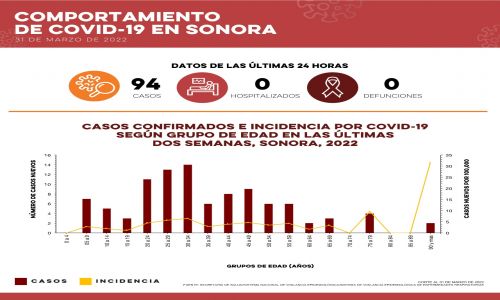 | Hermosillo, Sonora; 31 de marzo de 2022.- Este día la Secretaría de Salud de Sonora (SSA) confirmó 94 casos y ninguna defunción por Covid-19.