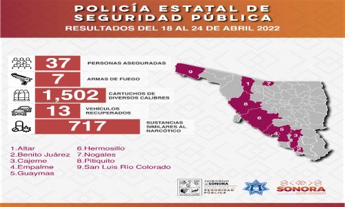 Los resultados generados en la semana del 18 al 24 de abril fueron producto de la operatividad coordinada de la PESP con los tres órdenes de gobierno en Altar, Benito Juárez, Cajeme, Empalme, Guaymas, Hermosillo, Nogales, Pitiquito y San Luis Río Colorado.