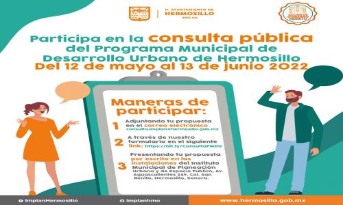 Hermosillo, Sonora; mayo 12 de 2022.- A partir de este jueves 12 de mayo de 2022, el Instituto Municipal de Planeación Urbana y del Espacio Público (IMPLAN), del Ayuntamiento de Hermosillo, arranca un ciclo de consultas vecinales con convocatoria abierta a quienes deseen hacer sus aportes a la planeación del desarrollo urbano de esta capital.