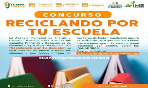 Hermosillo, Sonora, junio 25 de 2022.- La Agencia Municipal de Energía y Cambio Climático (AMEC) invita a estudiantes de las primarias y secundarias de Hermosillo a participar en el concurso Reciclando por tu Escuela, para recopilar papel.