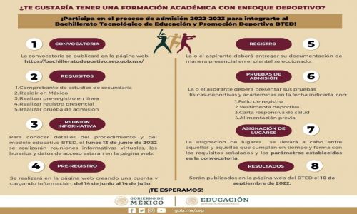 Para mayor información está disponible la página web de BTED https://bachilleratodeportivo-sep-gob-mx en donde pueden checarse los detalles y procedimientos del modelo educativo.